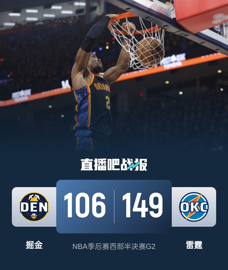 比赛上来,穆雷先拿两分后雷霆打出一波7-0的小高潮取得领先,掘金整个第一节完全被对手压制,可以说是攻不进防不住,雷霆单节轰下45分建立起24分的巨大领先优势,次节掘金的进攻表现有所好转,但是防守端依旧无法控制雷霆的攻势,分差继续突破三十分,半场结束时雷霆领先31分;下半场回来,雷霆依旧没有丝毫松懈,单节再轰37分净胜17分,三节过后已经领先48分,约基奇更是在三节未结束就已经犯满离场,末节比赛早已沦为垃圾时间,最终雷霆大胜掘金将大比分追至1-1平。