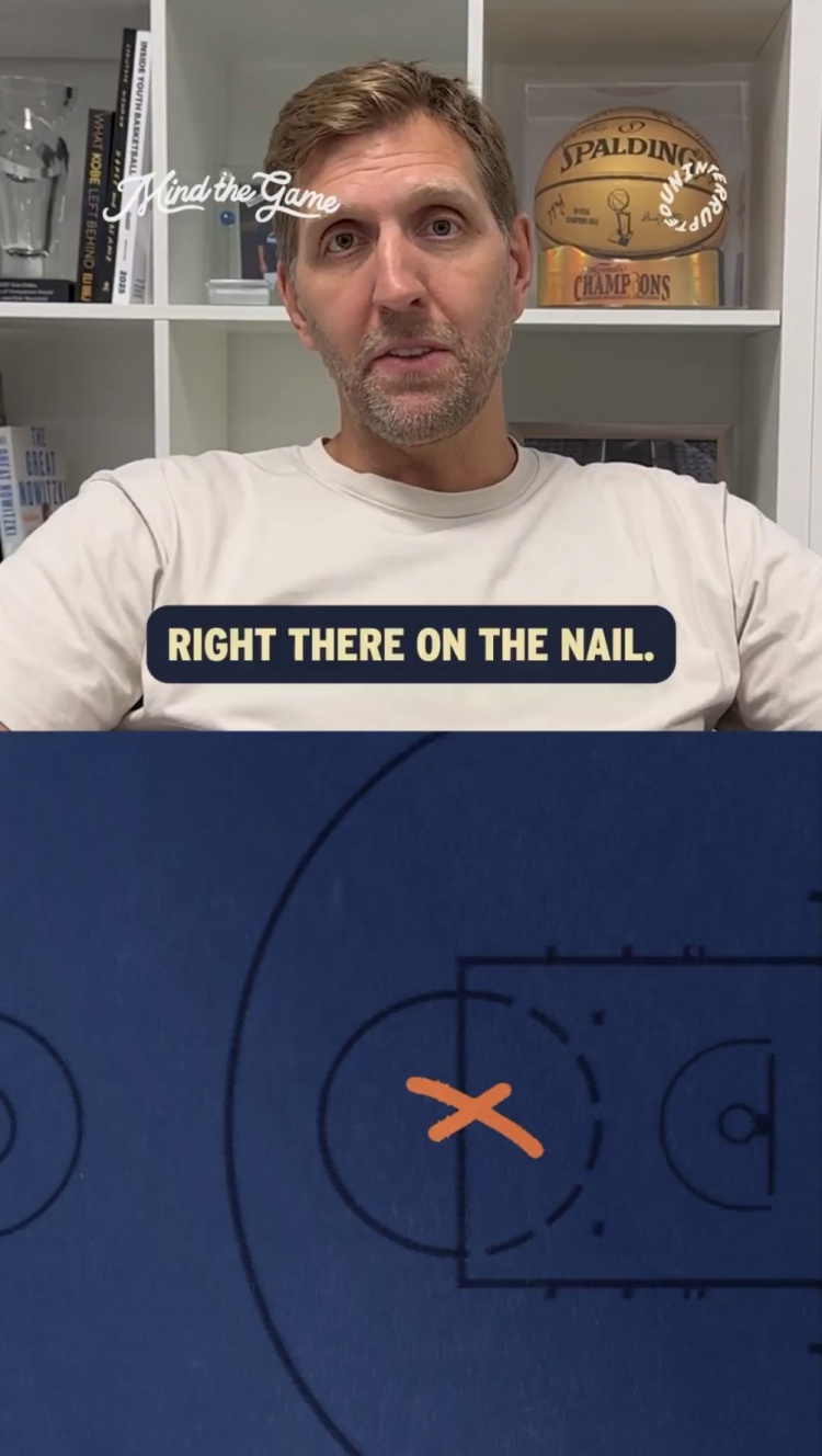 诺维茨基说:“嗨,勒布朗和史蒂夫,感谢你们对我的夸赞。这个甲区单打起始于对手球队在面对我的挡拆时大量换防,等我面对小个球员运球卷切到三秒区内时,另一个防守人会从弱侧换防回来。这样你的进攻时间所剩无几,但等我转身过后,我的身边还有一个大个防我。
