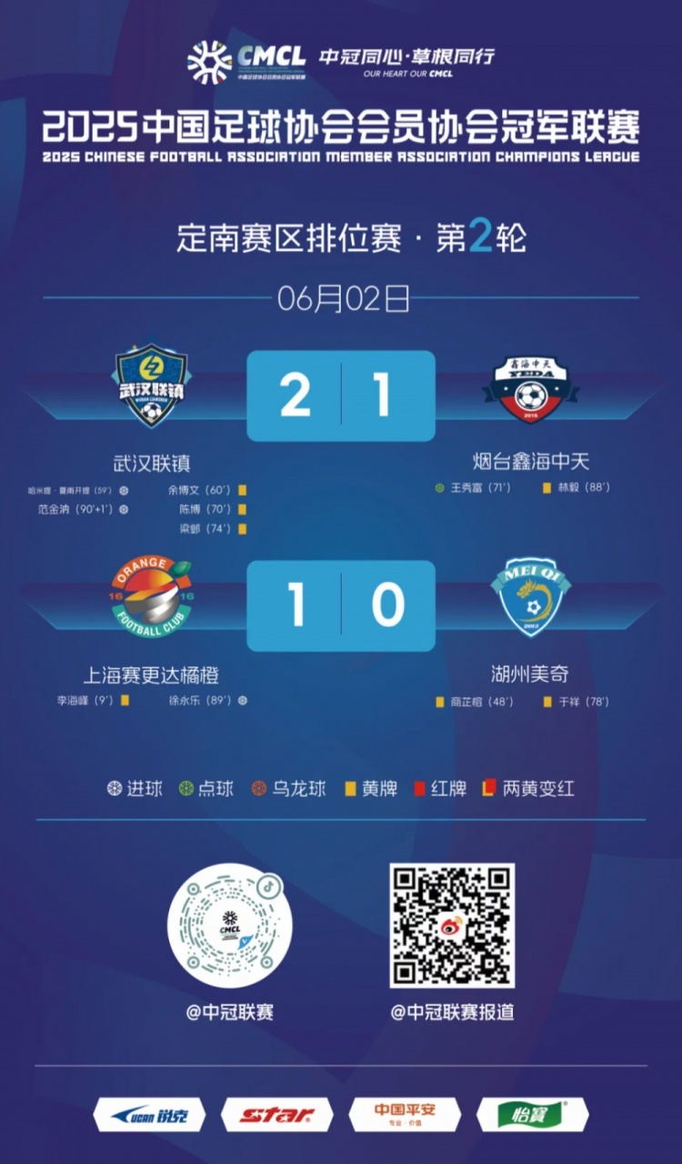 最终全场比赛结束,武汉联镇2-1烟台鑫海中天,武汉联镇以定南赛区晋级组一胜一平一负积4分位列小组第三,烟台鑫海中天则位列第四。