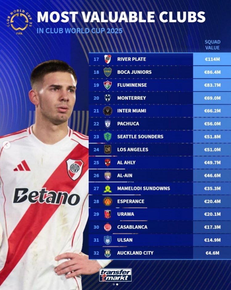 世俱杯各队身价排名:皇马13.3亿欧居首 奥克兰城最低仅460万欧