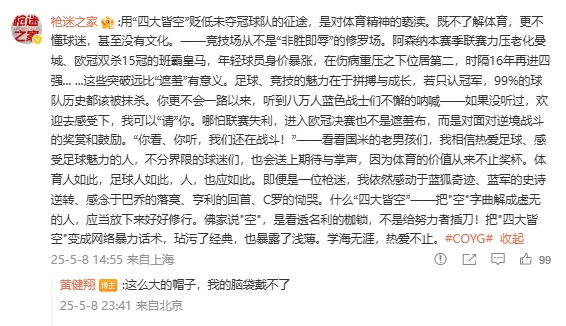 而著名阿森纳球迷号“枪迷之家”在评论区发文质疑黄健翔用词不当:“用“四大皆空”贬低未夺冠球队的征途,是对体育精神的亵渎。既不了解体育,更不懂球迷,甚至没有文化。——竞技场从不是“非胜即辱”的修罗场。阿森纳本赛季联赛力压老化曼城、欧冠双杀15冠的班霸皇马,年轻球员身价暴涨,在伤病重压之下位居第二,时隔16年再进四强... ...这些突破远比“遮羞”有意义。足球、竞技的魅力在于拼搏与成长,若只认冠军,99%的球队历史都该被抹杀。你更不会一路以来,听到八万人蓝色战士们不懈的呐喊——如果没听过,欢迎去感受下,我可以“请”你。哪怕联赛失利,进入欧冠决赛也不是遮羞布,而是对面对逆境战斗的奖赏和鼓励。“你看、你听,我们还在战斗!”——看看国米的老男孩们,我相信热爱足球、感受足球魅力的人,不分界限的球迷们,也会送上期待与掌声,因为体育的价值从来不止奖杯。体育人如此,足球人如此,人,也应如此。即便是一位枪迷,我依然感动于蓝狐奇迹、蓝军的史诗逆转、感念于巴乔的落寞、亨利的回首、C罗的恸哭。什么“四大皆空”——把"空"字曲解成虚无的人,应当放下来好好修行。佛家说"空",是看透名利的枷锁,不是给努力者插刀!把"四大皆空"变成网络暴力话术,玷污了经典,也暴露了浅薄。学海无涯,热爱不止。”