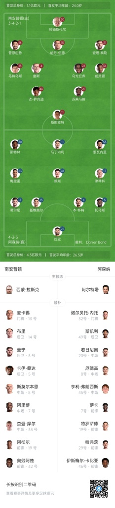 南安普顿替补:1-麦卡锡、14-布里、3-曼宁、39-卡伊-桑达、8-斯莫尔伯恩、33-杰登-摩尔、7-阿里博、19-阿彻尔、32-奥努阿楚