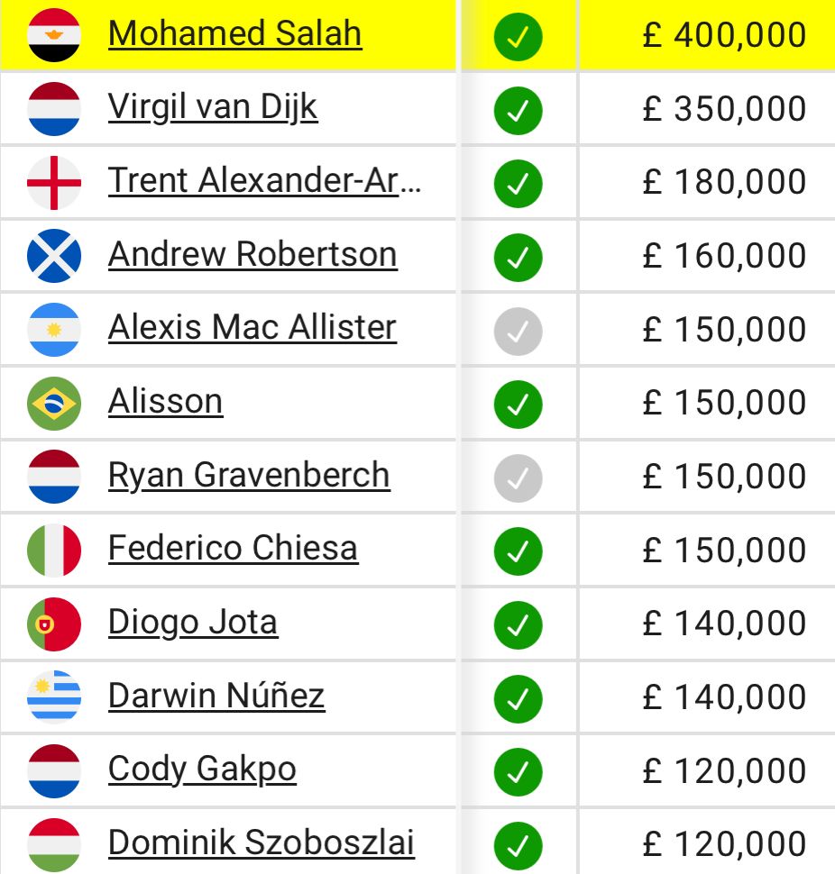据专门研究球员薪水的数据机构capology统计,利物浦目前顶薪球员为刚刚续约不久的萨拉赫和范迪克,两人的周薪分别为40万镑以及35万镑。